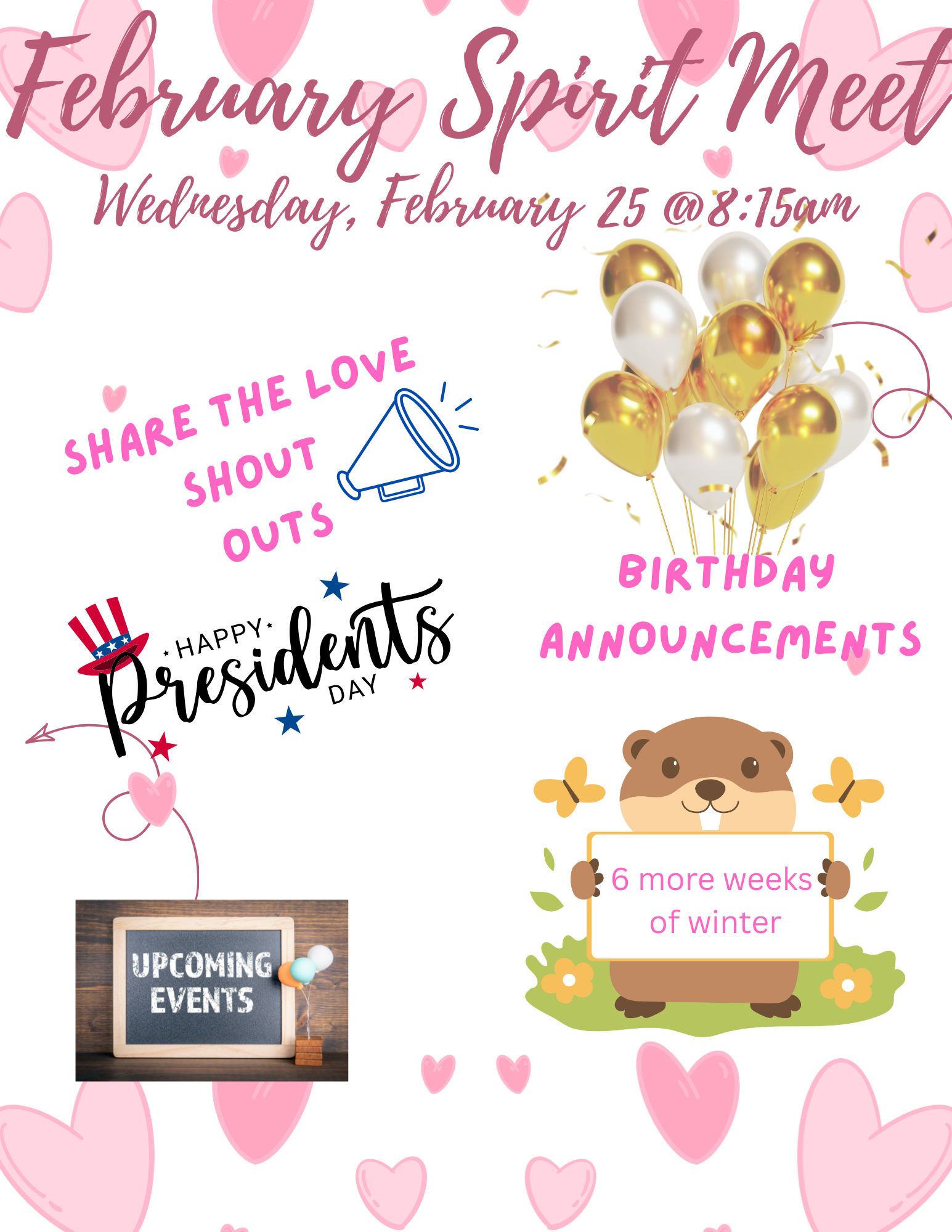 Join us on Wednesday, February 25, 2026, at 8:15am for our quarterly Spirit Meet. Some of our classes will be presenting on topics they have been working on, awards will be handed out, and fun will...